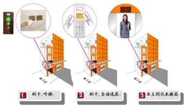 樓宇對講系統(tǒng)“電梯控制器”采集每戶對講分機的“開鎖”按鍵信號,并提供通信協(xié)議,實現(xiàn)樓宇對講系統(tǒng)與電梯樓層控制系統(tǒng)的通信;電梯樓層控制系統(tǒng)從“電梯控制器”上獲取業(yè)主的樓層信號,使該層的電梯按鈕在電梯開門后一定時間內(nèi)可以被登記,訪客進入電梯后按鍵即可到達相應(yīng)樓層。