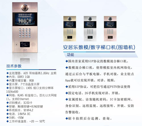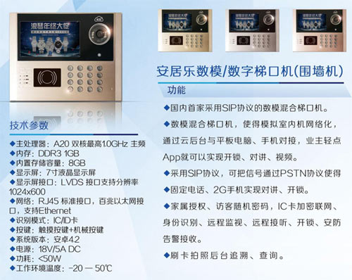 安居樂數(shù)字對講系統(tǒng)把模擬信號和數(shù)字信號融為一體,安居樂數(shù)字后臺搭建業(yè)主、物業(yè)管理、周界商圈、廣告經(jīng)營、O2O的大數(shù)據(jù)交流平臺,充分發(fā)揮各自優(yōu)勢資源,共同營造增值空間,體現(xiàn)各自社會價值。讓用戶切身體驗到:"家就在眼前,社區(qū)就在身邊,世界就在指尖,生活就在安居樂。"