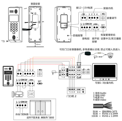 門口機功能: 可接室內機, 可實現(xiàn)呼叫、視頻傳輸、雙向對講、開鎖功能。